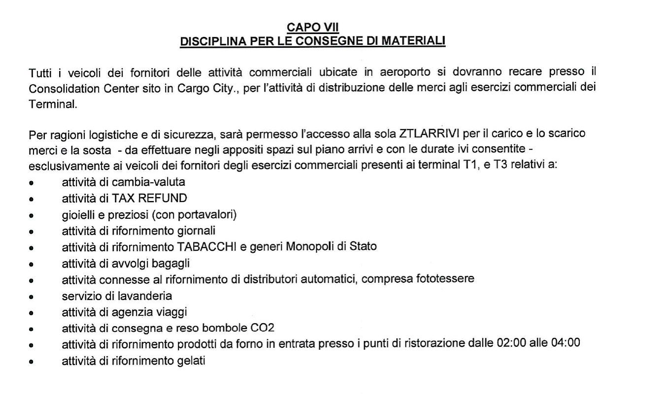 I fornitori di Aeroporti di Roma SpA, delle società del Gruppo ADR, delle società e degli esercizi commerciali all'interno dei Terminal, dovranno recarsi presso il Consolidation Center della Cargo City. Potranno accedere alla ZTL Arrivi solo coloro che rientrano nei casi normati al Capo VII del Regolamento allegato all’Ordinanza ENAC 3/2024. In questo caso, il tempo di permanenza massimo sarà di 30 minuti avendo cura di ottenere l'autorizzazione tramite compilazione e invio del modulo in calce a questa pagina.
