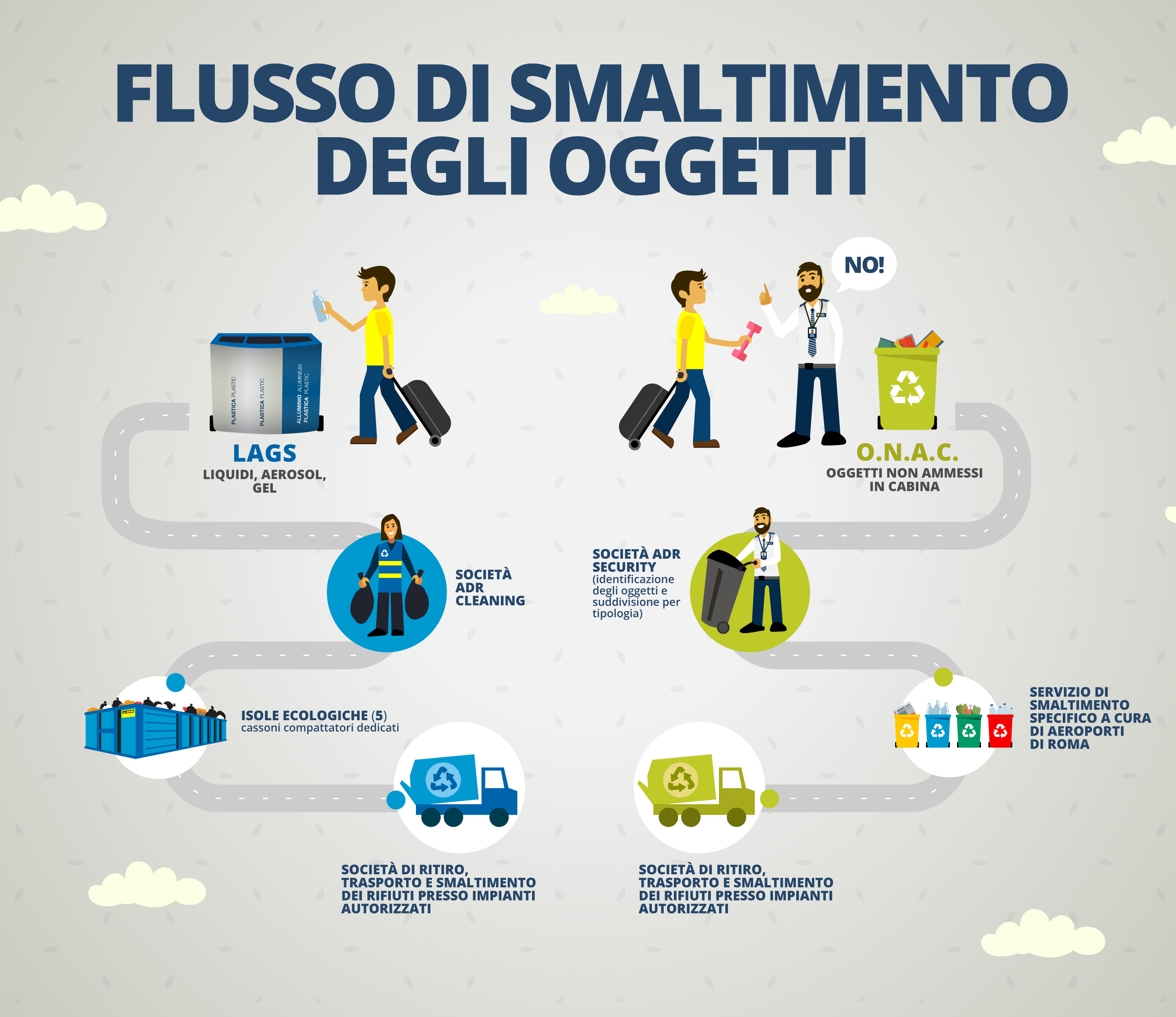 In aeroporto, a ridosso dei varchi di controllo, sono allocati degli appositi contenitori che il passeggero potrà utilizzare per liberarsi di tutti quegli oggetti non ammessi in cabina e che non sono stati preventivamente posti nel bagaglio registrato al check-in. Aeroporti di Roma,  si occuperà successivamente dello smaltimento di questi oggetti, ovvero i L.A.G.S* e gli O.N.A.C.